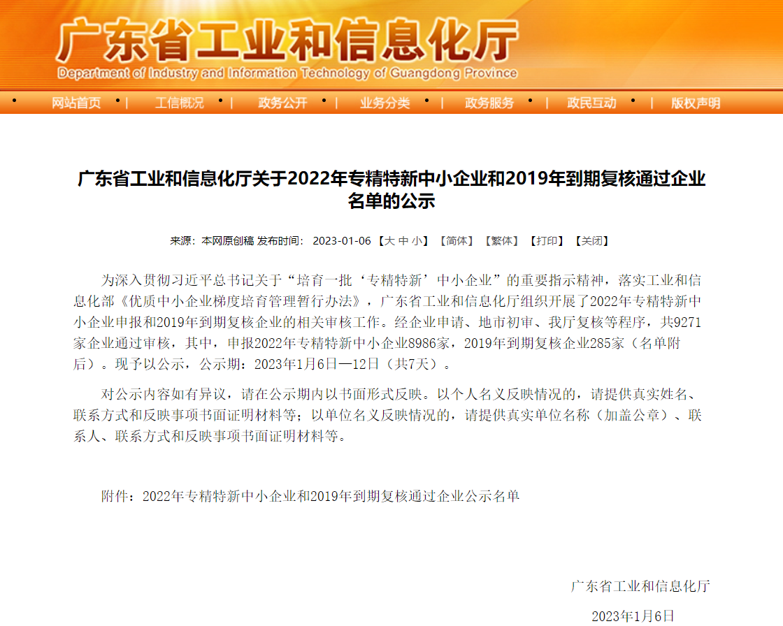 恭喜!子公司聚明通过广东省“专精特新”中小企业认定